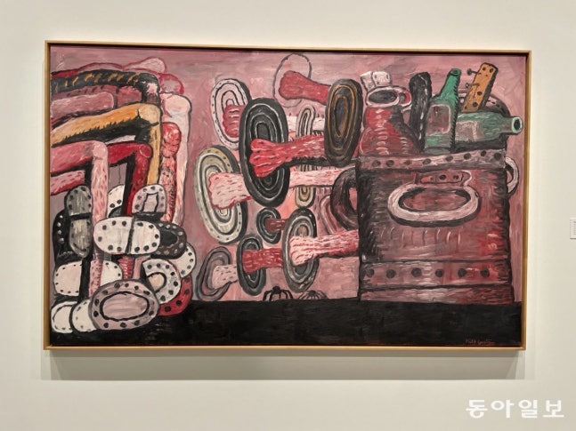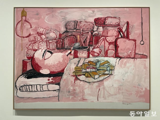 이 작품은 미국의 화가 필립 거스턴(1913~1980)이 1973년 그린 ‘그리기, 담배피기, 먹기’입니다. 대충 보면 귀여운 것도 같지만 자세히 보면 섬뜩한 이 그림에는 무슨 사연이 있을까요?